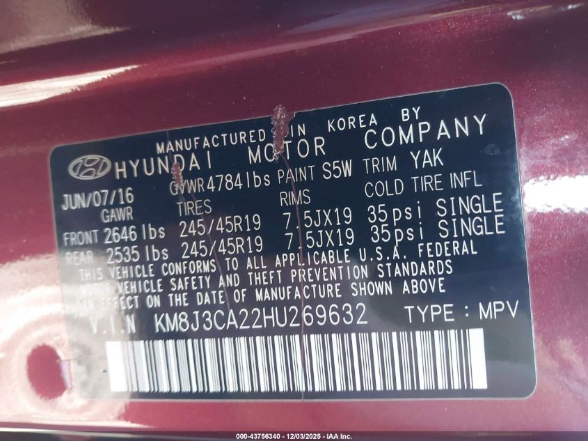 Цвет КрасныйЦилиндры 4Привод Полный приводVIN KM8J3CA22HU269632Состояние Заводится и едет (проверено)Повреждения Передняя правая AutoRIA
