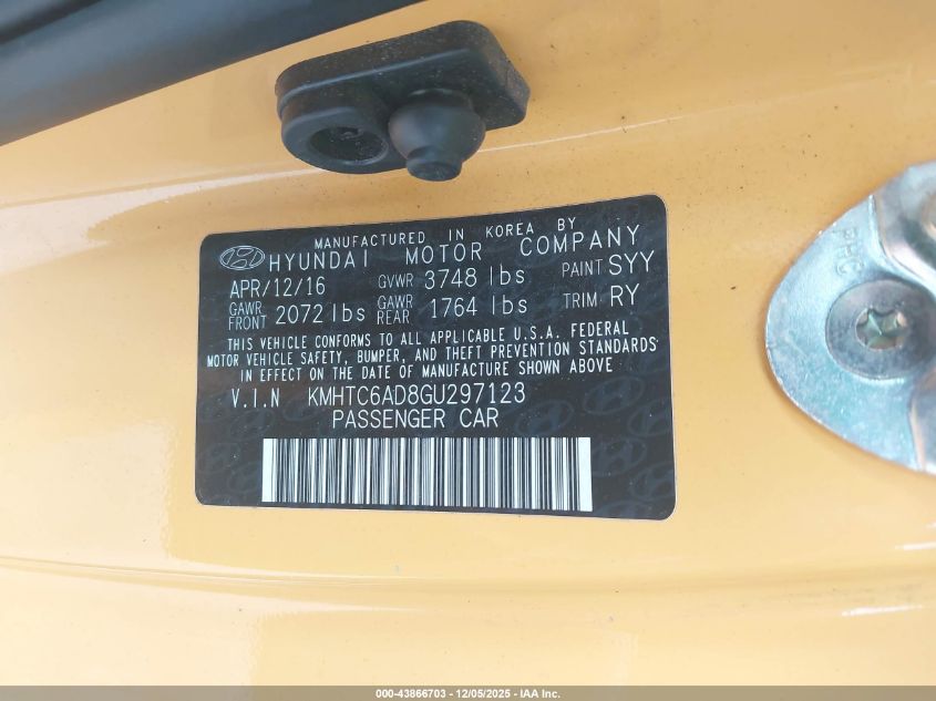 2016 HYUNDAI VELOSTER 2016 року Бензин, 1.6, Передний привод, vin - KMHTC6AD8GU297123 из США