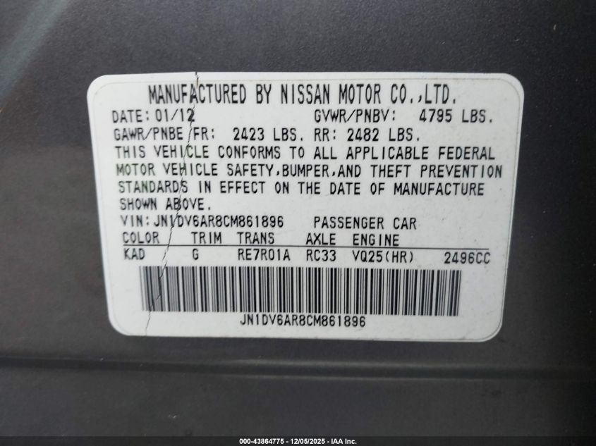 Цвет СерыйЦилиндры 6Привод Полный приводVIN JN1DV6AR8CM861896Состояние Заводится и едет (проверено)Повреждения Задняя левая AutoRIA