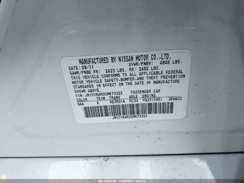 Цвет БелыйЦилиндры 6Привод Полный приводVIN JN1CV6AR0CM673322Состояние Заводится и едет (проверено)Повреждения Задняя левая AutoRIA