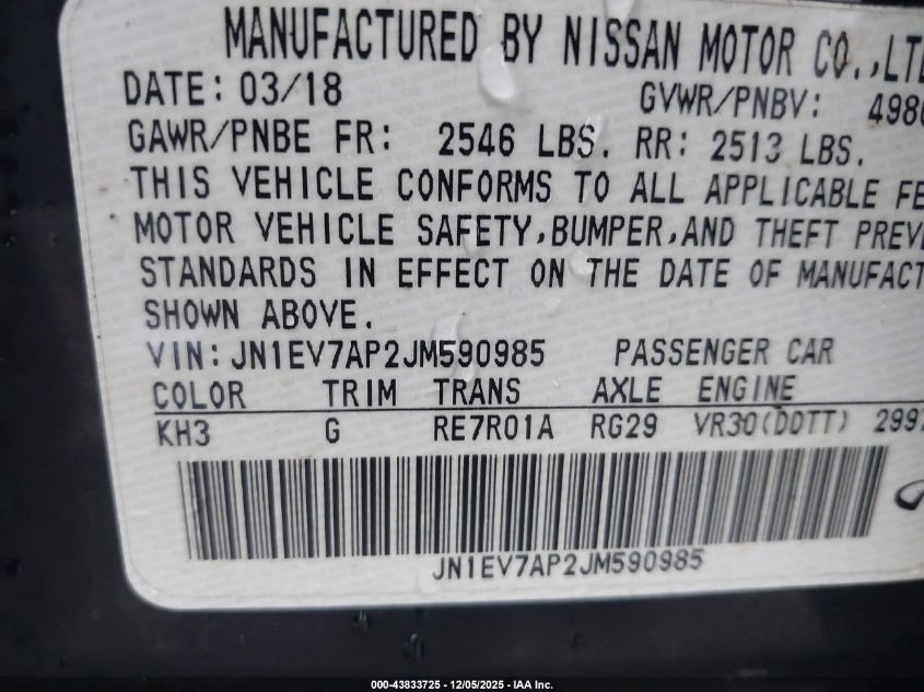 Цвет ЧерныйЦилиндры 6Привод Задний приводVIN JN1EV7AP2JM590985Состояние Заводится и едет (проверено)Повреждения Передняя или задняя AutoRIA