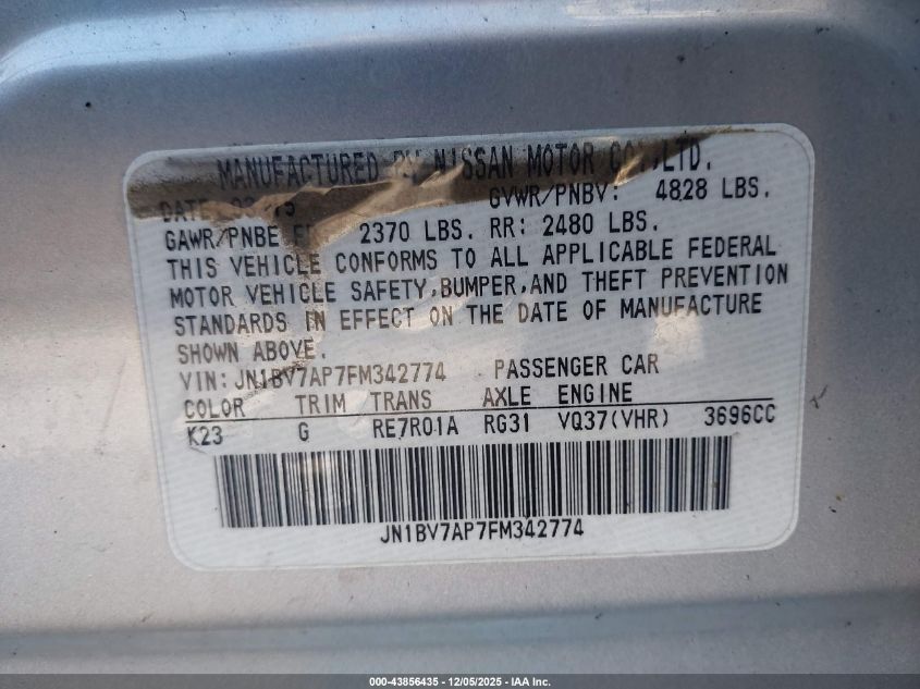 Цвет СеребряныйЦилиндры 6Привод Задний приводVIN JN1BV7AP7FM342774Состояние СтационарноПовреждения Пожар AutoRIA