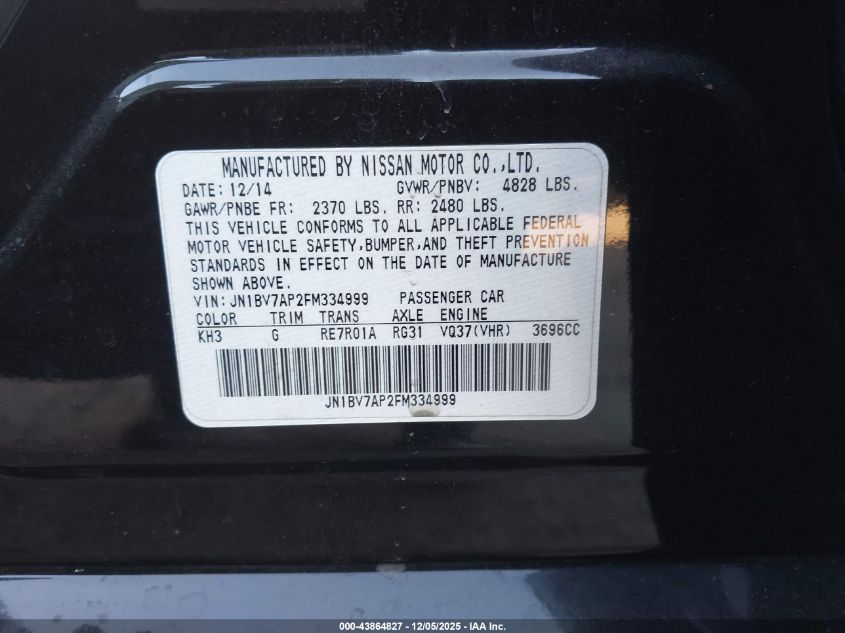 Цвет ЧерныйЦилиндры 6Привод Задний приводVIN JN1BV7AP2FM334999Состояние СтационарноПовреждения Передняя или задняя AutoRIA