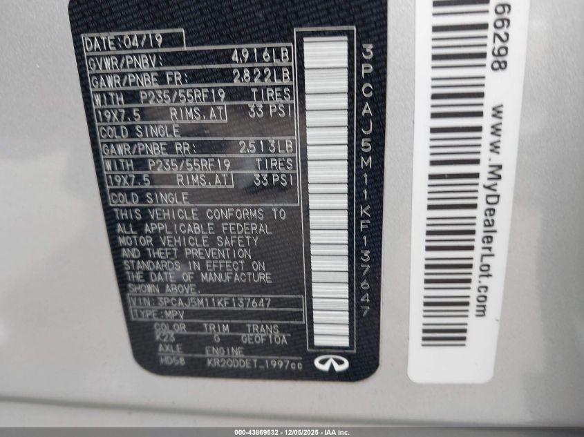 2019 INFINITI QX50 2019 року Бензин, 2.0, Передний привод, vin - 3PCAJ5M11KF137647 из США