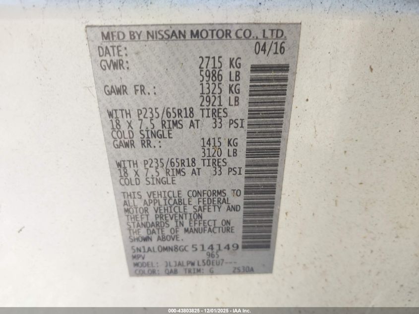 Цвет БелыйЦилиндры 6Привод Передний приводVIN 5N1AL0MN8GC514149Состояние Заводится и едет (проверено)Повреждения Передняя правая AutoRIA