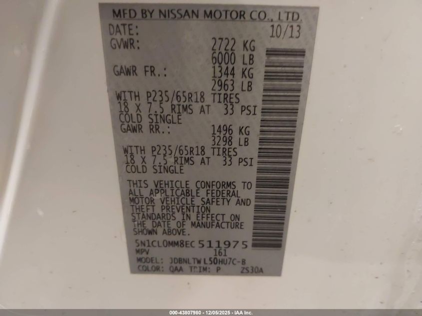 Цвет БелыйЦилиндры 4Привод Полный приводVIN 5N1CL0MM8EC511975Состояние Заводится и едет (проверено)Повреждения Передняя или задняя AutoRIA