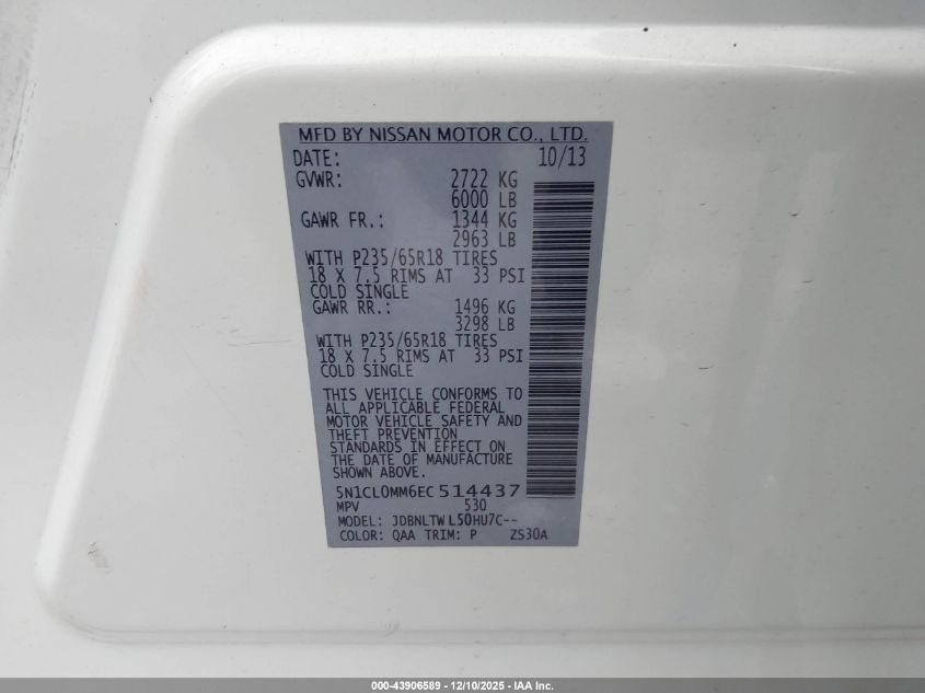 Цвет БелыйЦилиндры 4Привод Полный приводVIN 5N1CL0MM6EC514437Состояние Заводится и едет (проверено)Повреждения Обычный износДата аукциона 2025-12-16 AutoRIA