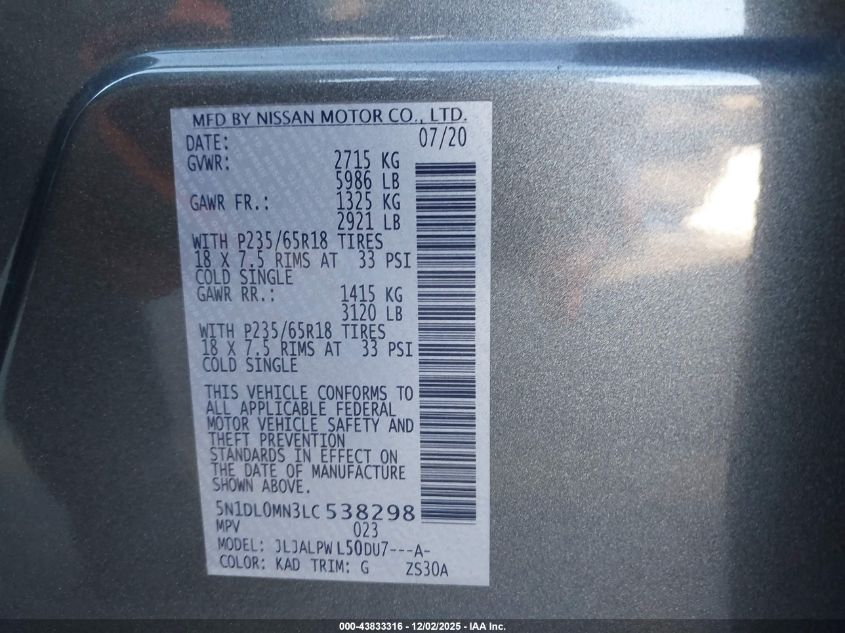 Цвет СерыйЦилиндры 6Привод Передний приводVIN 5N1DL0MN3LC538298Состояние СтационарноПовреждения Передняя или задняя AutoRIA