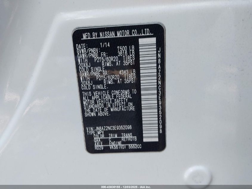 Цвет БелыйЦилиндры 8Привод Полный приводVIN JN8AZ2NC3E9352098Состояние СтационарноПовреждения Передняя или задняя AutoRIA