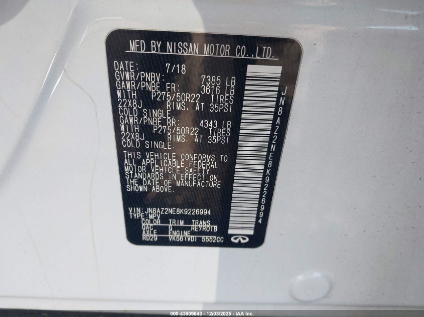 2019 INFINITI QX80 2019 року Бензин, 5.6, Полный привод, vin - JN8AZ2NE8K9226994 из США