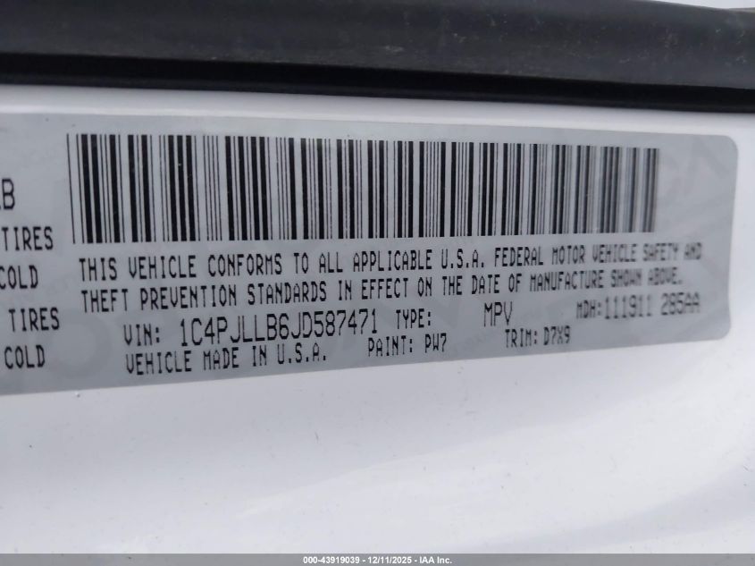 Цвет БелыйЦилиндры 4Привод Передний приводVIN 1C4PJLLB6JD587471Состояние НеизвестноПовреждения Неизвестно AutoRIA