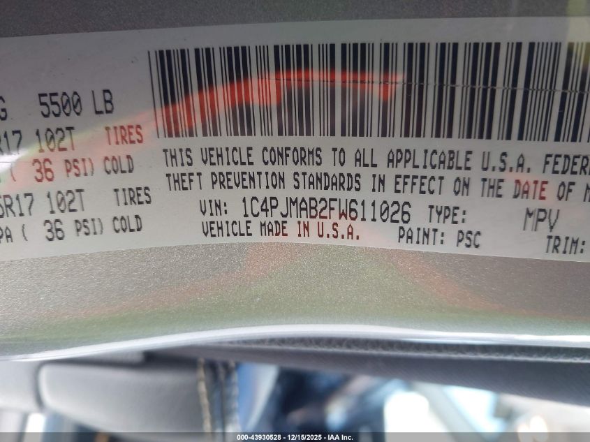 Цвет СерыйЦилиндры 4Привод Полный приводVIN 1C4PJMAB2FW611026Состояние НеизвестноПовреждения Неизвестно AutoRIA