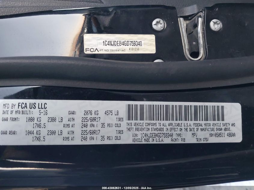 Цвет ЧерныйЦилиндры 4Привод Полный приводVIN 1C4NJDEB4GD759340Состояние СтационарноПовреждения Левая сторона AutoRIA