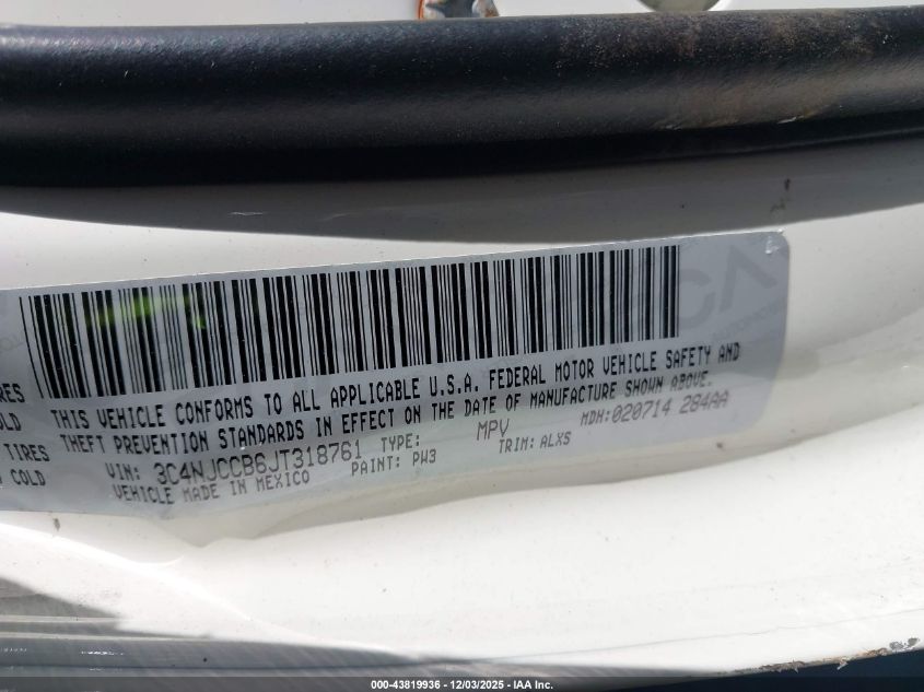 Цвет БелыйЦилиндры 4Привод Передний приводVIN 3C4NJCCB6JT318761Состояние СтационарноПовреждения По всему авто AutoRIA