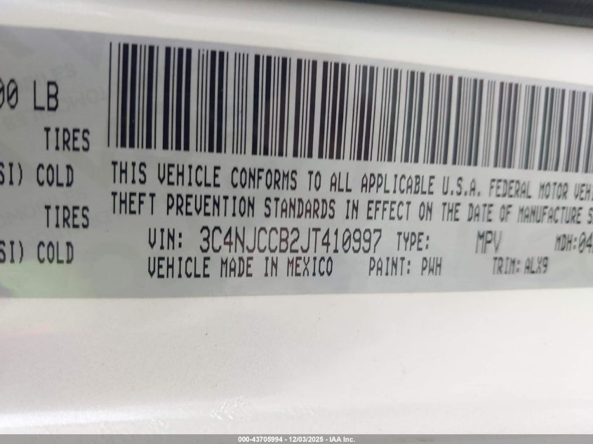 Цвет БелыйЦилиндры 4Привод Передний приводVIN 3C4NJCCB2JT410997Состояние СтационарноПовреждения Передняя левая AutoRIA