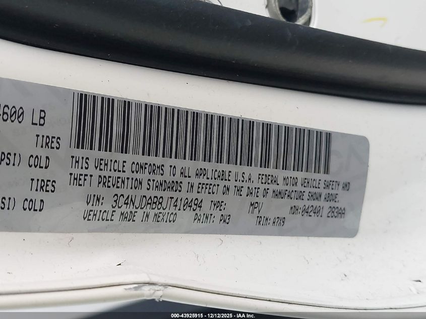 Цвет БелыйЦилиндры 4Привод Полный приводVIN 3C4NJDAB8JT410494Состояние Заводится и едет (проверено)Повреждения Левая сторона AutoRIA