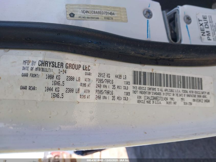 Цвет БелыйЦилиндры 4Привод Передний приводVIN 1C4NJCBA8ED731494Состояние Заводится и едет (проверено)Повреждения Передняя или задняя AutoRIA