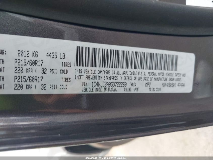 Цвет СерыйЦилиндры 4Привод Передний приводVIN 1C4NJCBA0GD722260Состояние Заводится и едет (проверено)Повреждения Правая сторона AutoRIA
