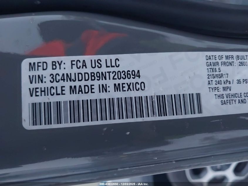 Цвет СерыйЦилиндры 4Привод Полный приводVIN 3C4NJDDB9NT203694Состояние СтационарноПовреждения Передняя или задняя AutoRIA