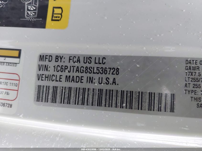 Цвет БелыйЦилиндры 6Привод Полный приводVIN 1C6PJTAG8SL536728Состояние СтационарноПовреждения Задняя правая