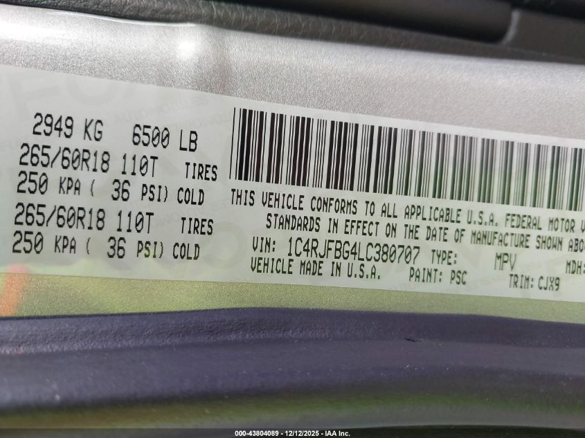 Цвет СерыйЦилиндры 6Привод Полный приводVIN 1C4RJFBG4LC380707Состояние СтационарноПовреждения Передняя или задняя AutoRIA