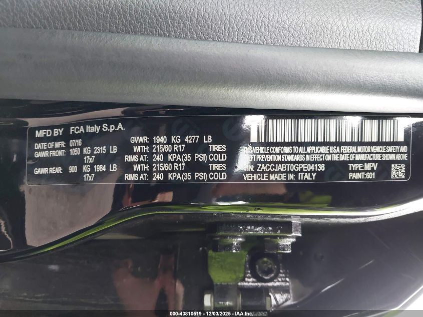 Цвет ЧерныйЦилиндры 4Привод Передний приводVIN ZACCJABT0GPE04136Состояние Заводится и едет (проверено)Повреждения Передняя или задняя AutoRIA