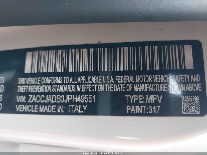 Цвет СеребряныйЦилиндры 4Привод Передний приводVIN ZACCJADB0JPH49551Состояние СтационарноПовреждения Передняя или задняя AutoRIA