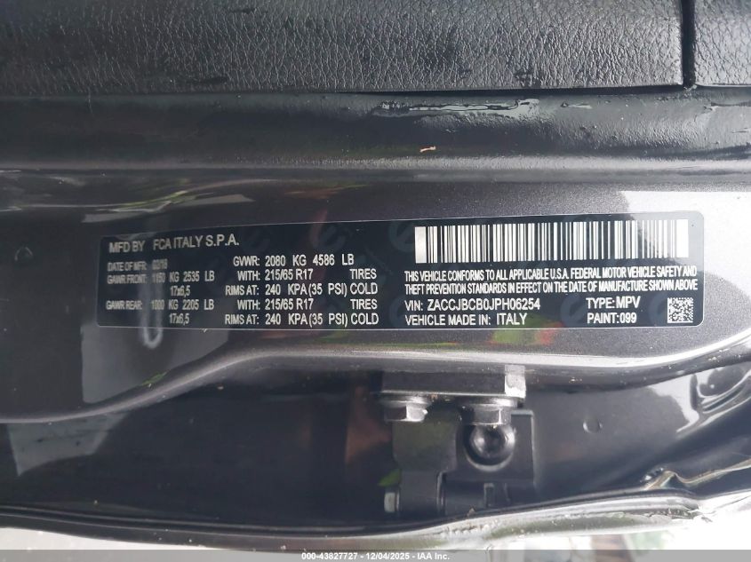 Цвет СерыйЦилиндры 4Привод Полный приводVIN ZACCJBCB0JPH06254Состояние СтационарноПовреждения Левая сторона AutoRIA