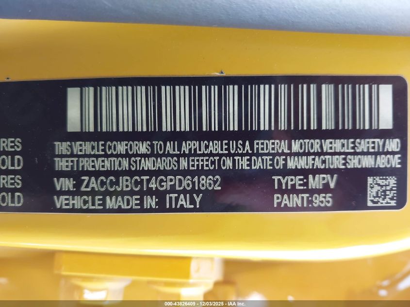 Цвет ЖелтыйЦилиндры 4Привод Полный приводVIN ZACCJBCT4GPD61862Состояние Заводится и едет (проверено)Повреждения Передняя левая AutoRIA