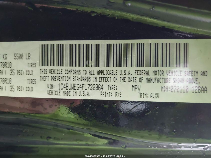 2015 JEEP WRANGLER 2015 року Бензин, 3.6, Полный привод, vin - 1C4BJWEG4FL732864 из США