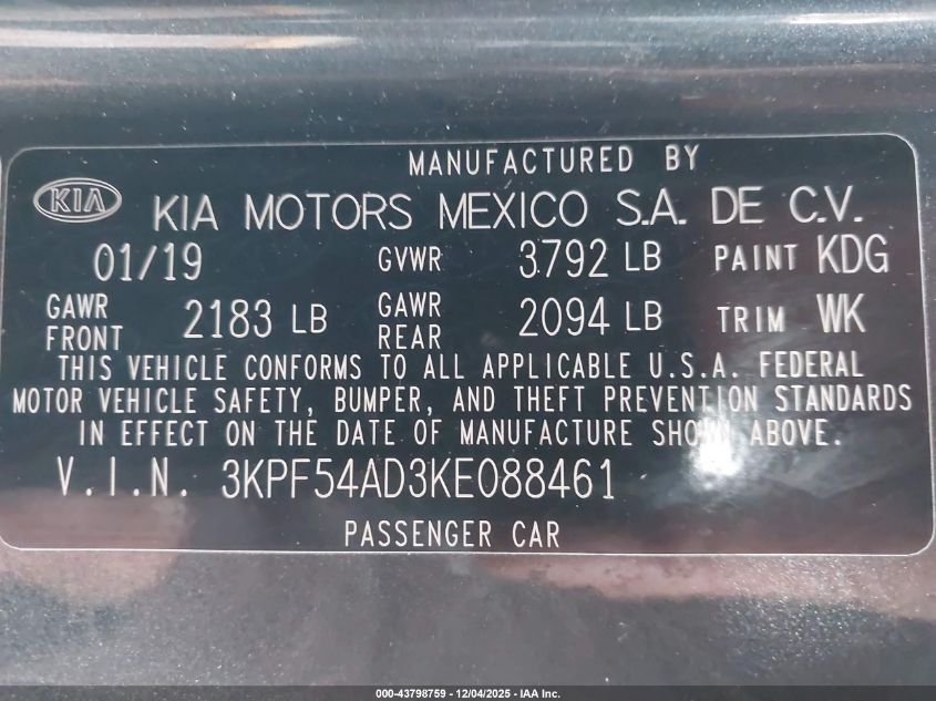 2019 KIA FORTE 2019 року Бензин, 2.0, Передний привод, vin - 3KPF54AD3KE088461 из США