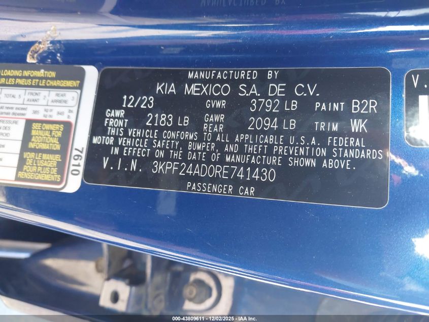 2024 KIA FORTE 2024 року Бензин, 2.0, Передний привод, vin - 3KPF24AD0RE741430 из США