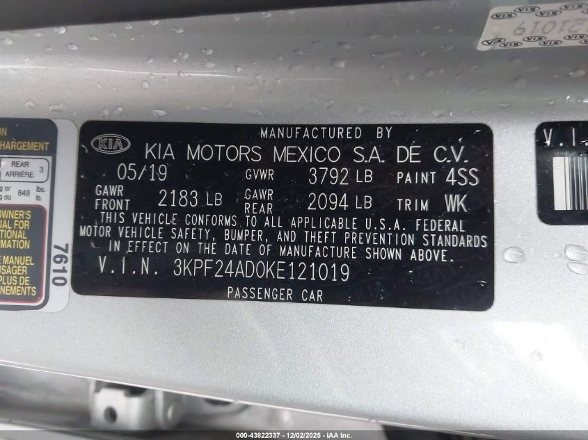 2019 KIA FORTE 2019 року Бензин, 2.0, Передний привод, vin - 3KPF24AD0KE121019 из США