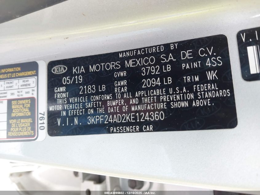 2019 KIA FORTE 2019 року Бензин, 2.0, Передний привод, vin - 3KPF24AD2KE124360 из США