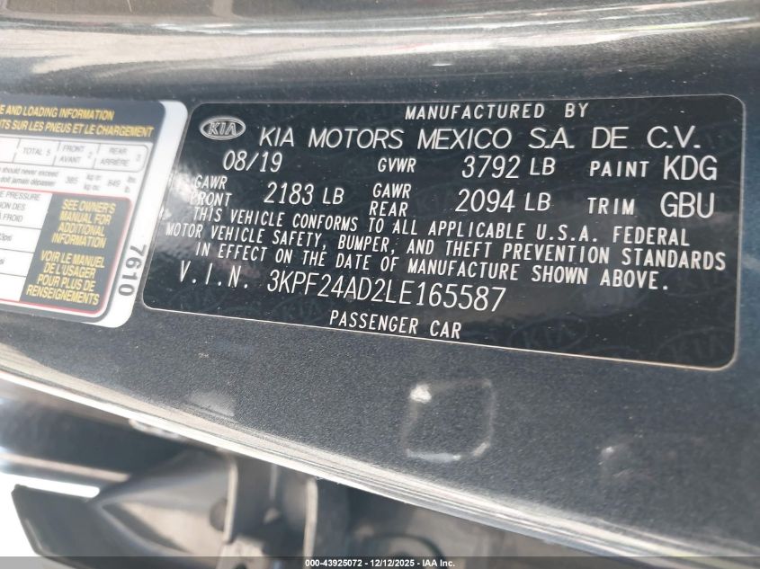 2020 KIA FORTE 2020 року Бензин, 2.0, Передний привод, vin - 3KPF24AD2LE165587 из США
