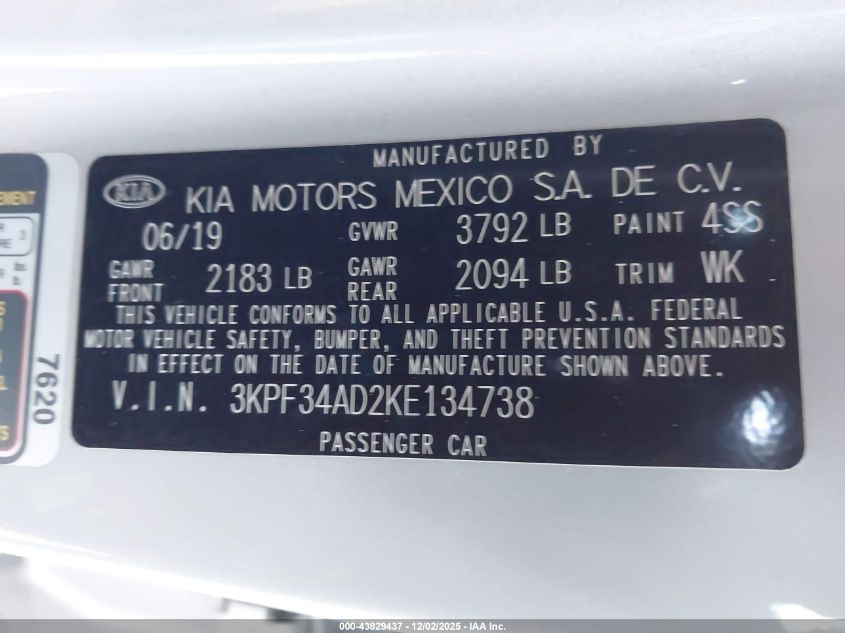 2019 KIA FORTE 2019 року Бензин, 2.0, Передний привод, vin - 3KPF34AD2KE134738 из США