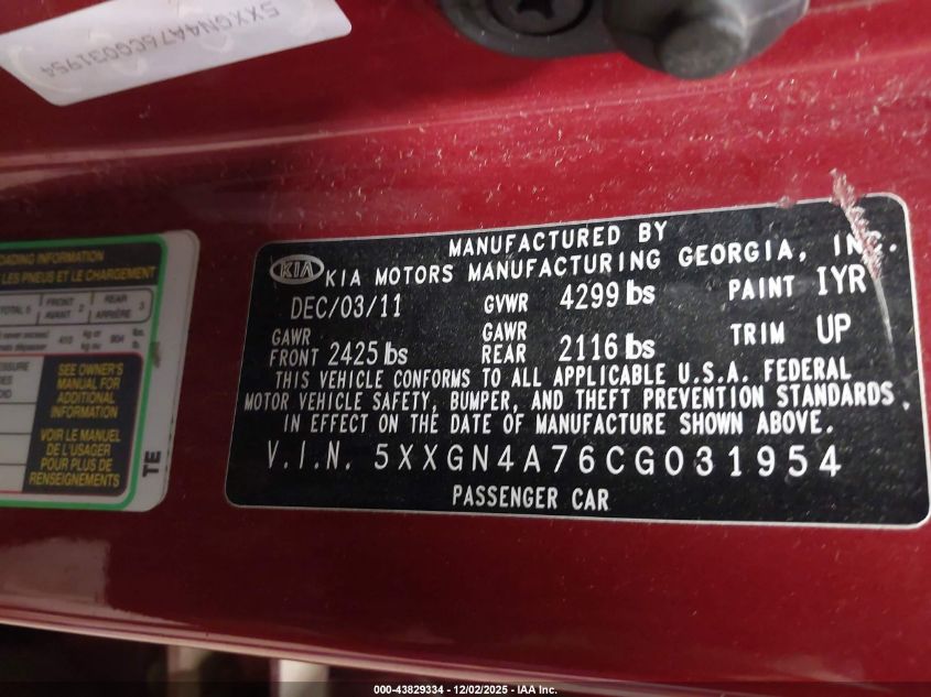 2012 KIA OPTIMA 2012 року Бензин, 2.4, Передний привод, vin - 5XXGN4A76CG031954 из США