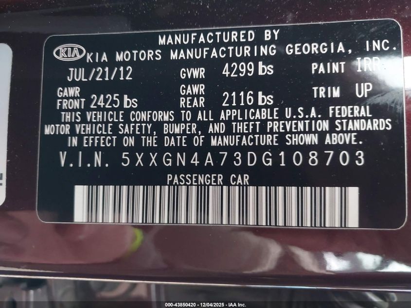 2013 KIA OPTIMA 2013 року Бензин, 2.4, Передний привод, vin - 5XXGN4A73DG108703 из США