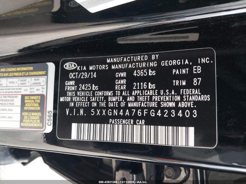 2015 KIA OPTIMA 2015 року Бензин, 2.4, Передний привод, vin - 5XXGN4A76FG423403 из США