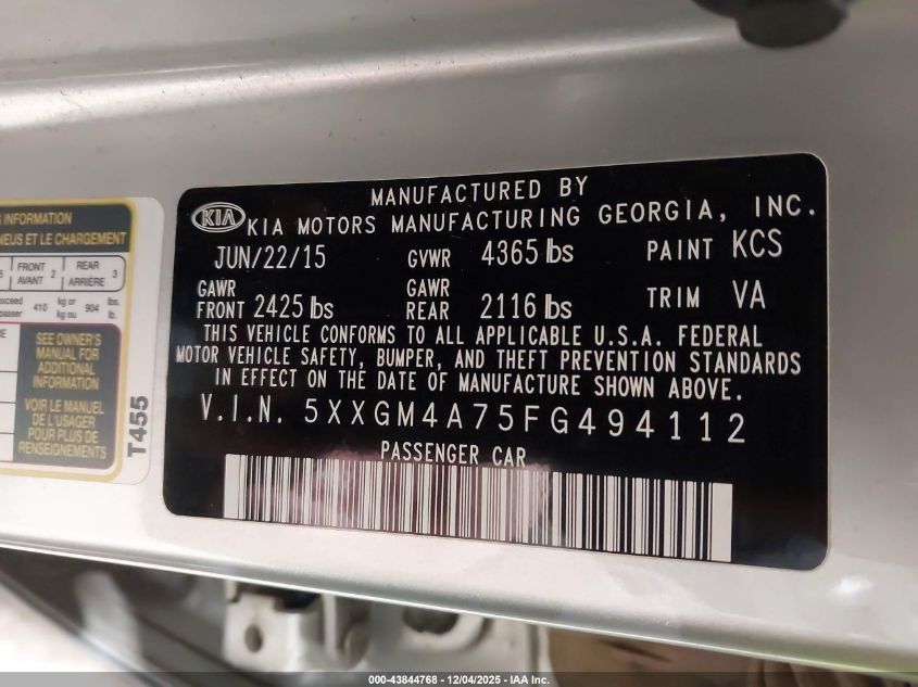 2015 KIA OPTIMA 2015 року Бензин, 2.4, Передний привод, vin - 5XXGM4A75FG494112 из США