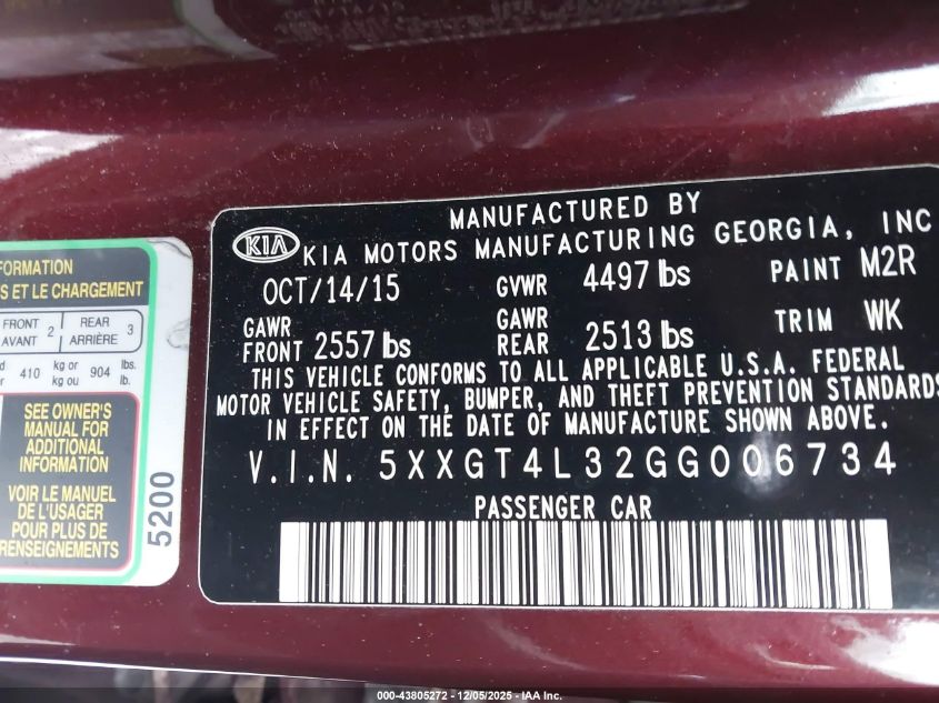 Цвет БургундияЦилиндры 4Привод Передний приводVIN 5XXGT4L32GG006734Состояние СтационарноПовреждения Незначительные AutoRIA