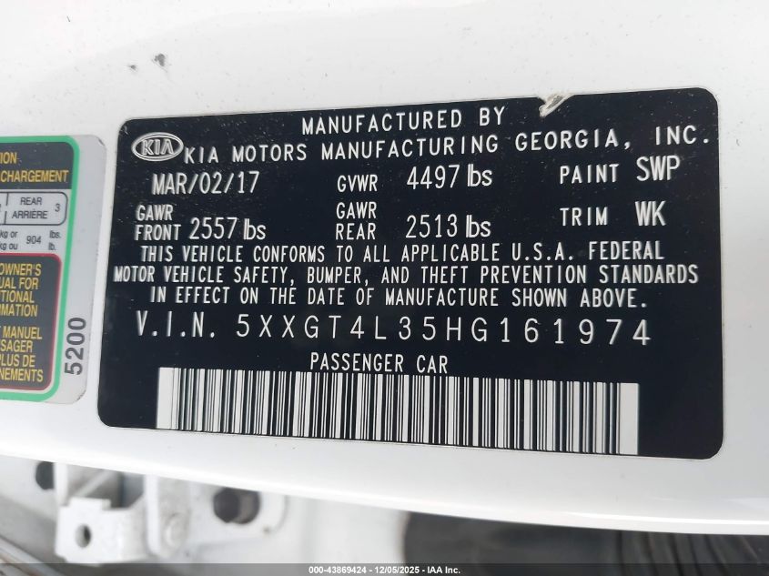 Цвет БелыйЦилиндры 4Привод Передний приводVIN 5XXGT4L35HG161974Состояние СтационарноПовреждения Обычный износ AutoRIA