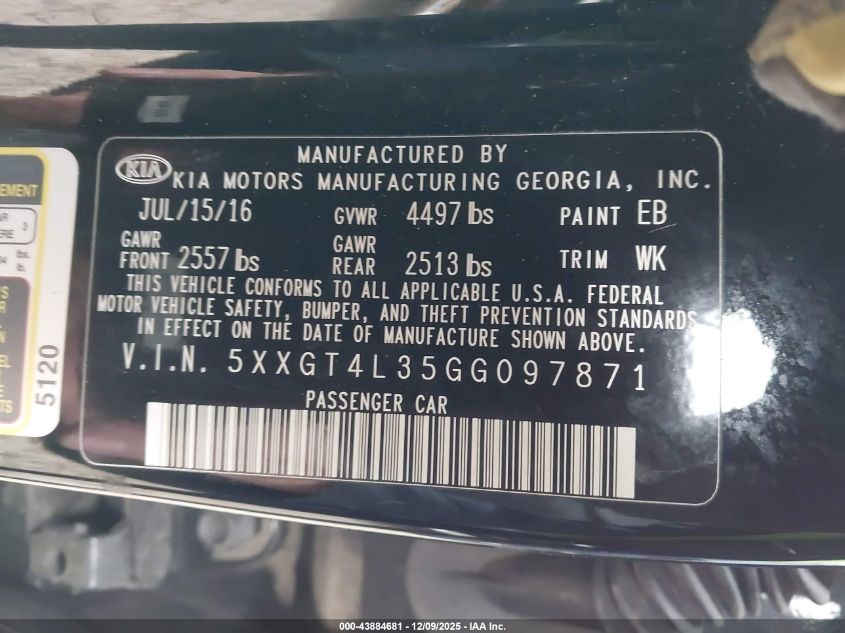 2016 KIA OPTIMA 2016 року Бензин, 2.4, Передний привод, vin - 5XXGT4L35GG097871 из США