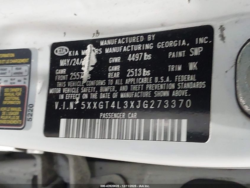 Цвет Цилиндры 4Привод Передний приводVIN 5XXGT4L3XJG273370Состояние НеизвестноПовреждения Неизвестно AutoRIA