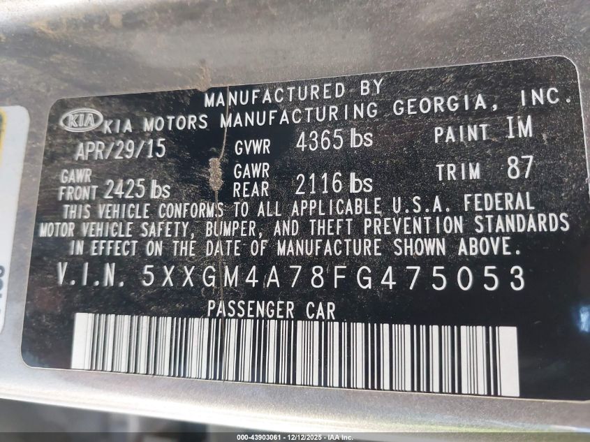 2015 KIA OPTIMA 2015 року Бензин, 2.4, Передний привод, vin - 5XXGM4A78FG475053 из США