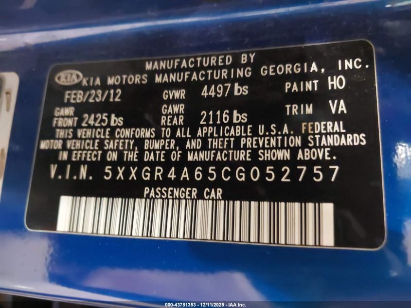 2012 KIA OPTIMA 2012 року Бензин, 2.0, Передний привод, vin - 5XXGR4A65CG052757 из США