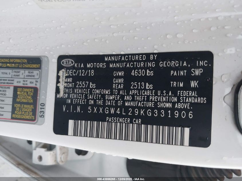 2019 KIA OPTIMA 2019 року Бензин, 2.0, Передний привод, vin - 5XXGW4L29KG331906 из США