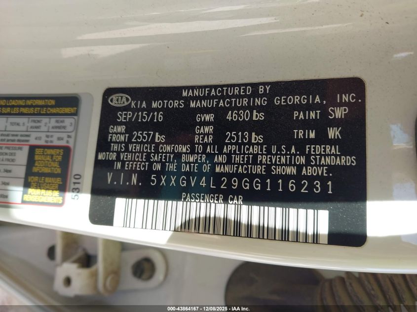 2016 KIA OPTIMA 2016 року Бензин, 2.0, Передний привод, vin - 5XXGV4L29GG116231 из США