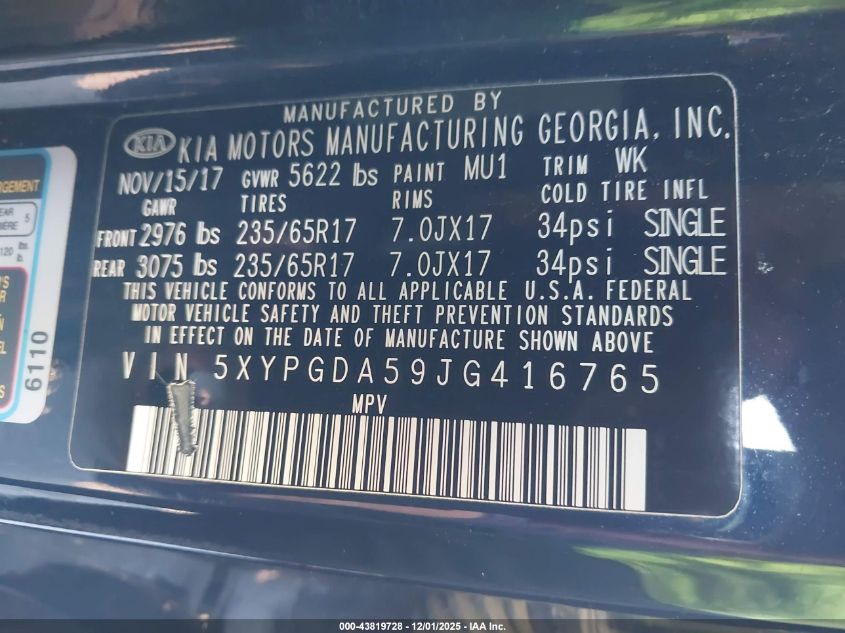 Цвет СинийЦилиндры 6Привод Полный приводVIN 5XYPGDA59JG416765Состояние СтационарноПовреждения ЗадняяДата аукциона 2025-12-09 AutoRIA