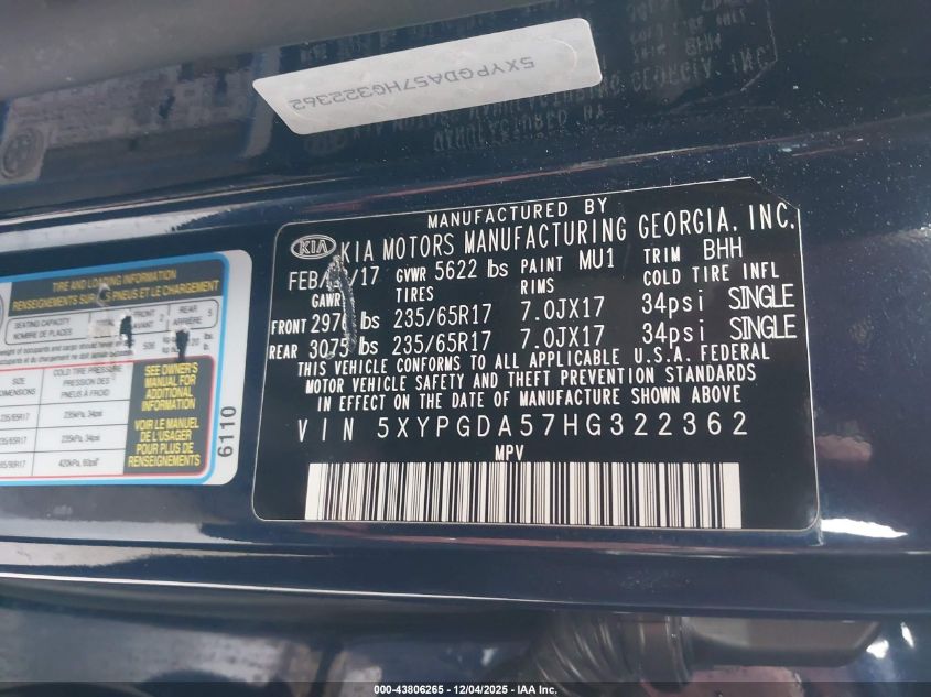 Цвет СинийЦилиндры 6Привод Полный приводVIN 5XYPGDA57HG322362Состояние СтационарноПовреждения Передняя или задняя AutoRIA